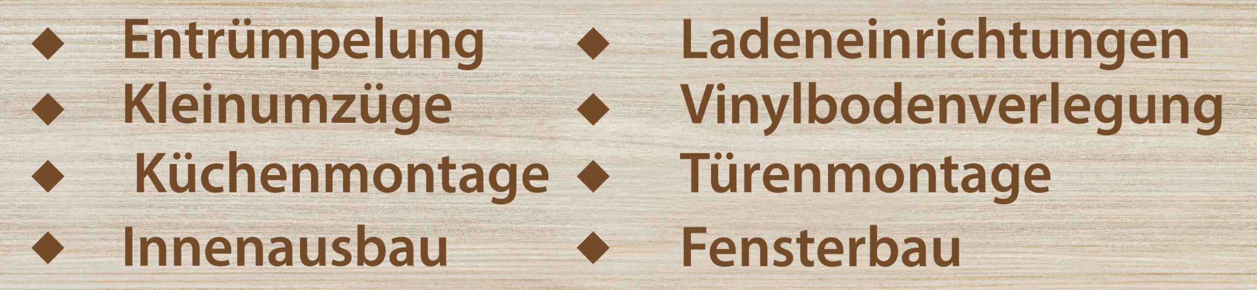 – *Entrümpelung:* Wir räumen Keller, Dachböden, Garagen und ganze Häuser. Schnell, gründlich und umweltfreundlich. – *Kleinumzüge:* Für Ihren Umzug innerhalb der Stadt oder in der Region – unkompliziert und stressfrei. – *Transport:* Sicherer und zuverlässiger Transport Ihrer Möbel und Gegenstände. – *Entsorgung:* Fachgerechte Entsorgung von Sperrmüll und Altgeräten.